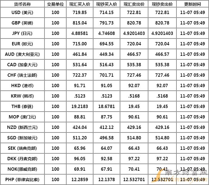 浦发银行外汇牌价表查询 11月7日浦发银行人民币汇率多少?下面同南方财富网大脸怪来看看。
