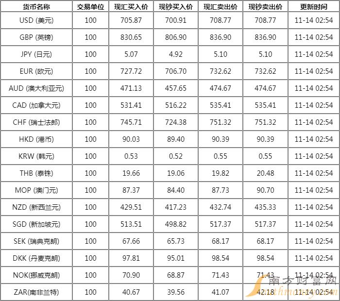 建设银行外汇牌价11月14日 建设银行人民币汇率多少?下面同南方财富网小鹿来看看。
