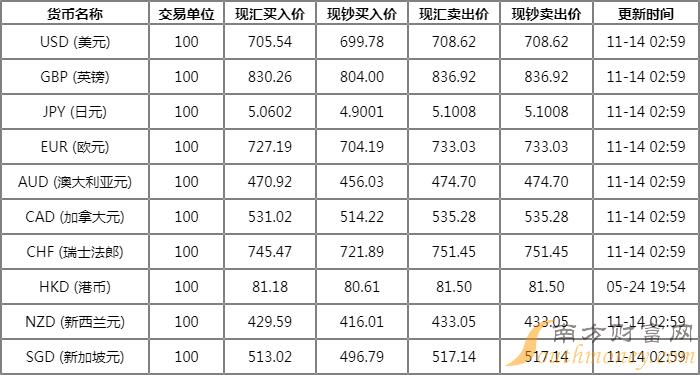 2022年11月14日银行间外汇市场人民币汇率中间价为1美元对人民币7.0899元,1欧元对人民币7.3264元,100日元对人民币5.0853元,1港元对人民币0.90449元,1英镑对人民币8.3660元,1澳大利亚元对人民币4.7437元,1新西兰元对人民币4.3273元,1新加坡元对人民币5.1597元,1瑞士法郎对人民币7.5152元,1加拿大元对人民币5.3427元,人民币1元对0.65184林吉特,人民币1元对8.5627俄罗斯卢布,人民币1元对2.4399南非兰特,人民币1元对185.59韩元,人民币1元对0.51799阿联酋迪拉姆,人民币1元对0.53020沙特里亚尔,人民币1元对55.2987匈牙利福林,人民币1元对0.63903波兰兹罗提,人民币1元对1.0159丹麦克朗,人民币1元对1.4668瑞典克朗,人民币1元对1.4007挪威克朗,人民币1元对2.61661土耳其里拉,人民币1元对2.7559墨西哥比索,人民币1元对5.0735泰铢。