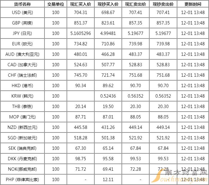 12月1日交通银行外汇牌价表 交行人民币对美元汇率是多少?下面同南方财富网小宋来看看。