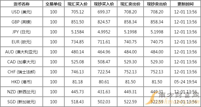 12月1日招商银行外汇牌价表 招行人民币对美元汇率是多少?下面同南方财富网点金君来看看。