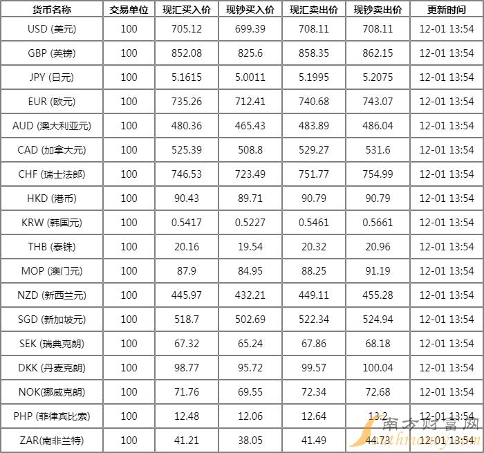 12月1日中国银行外汇牌价表 中行人民币对美元汇率是多少?下面同南方财富网小笔来看看。