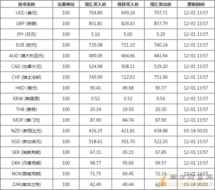12月1日中国农业银行外汇牌价表 农行人民币汇率是多少?下面同南方财富网怪咖君来看看。
