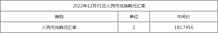 2022年12月1日银行间外汇市场人民币汇率中间价为:1美元对人民币7.1225元,1欧元对人民币7.4235元,100日元对人民币5.1712元,1港元对人民币0.91304元,1英镑对人民币8.6007元,1澳大利亚元对人民币4.8409元,1新西兰元对人民币4.4933元,1新加坡元对人民币5.2383元,1瑞士法郎对人民币7.5420元,1加拿大元对人民币5.3087元,人民币1元对0.62262马来西亚林吉特,人民币1元对8.5801俄罗斯卢布,人民币1元对2.4118南非兰特,人民币1元对183.98韩元,人民币1元对0.51568阿联酋迪拉姆,人民币1元对0.52780沙特里亚尔,人民币1元对55.1082匈牙利福林,人民币1元对0.62918波兰兹罗提,人民币1元对1.0019丹麦克朗,人民币1元对1.4720瑞典克朗,人民币1元对1.3800挪威克朗,人民币1元对2.61579土耳其里拉,人民币1元对2.7063墨西哥比索,人民币1元对4.9407泰铢。