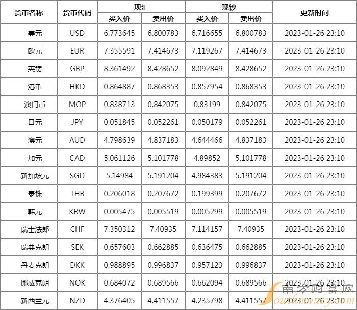2023年1月20日美元人民币中间价6.7702,新加坡元人民币中间价5.1249,纽元人民币中间价4.3323,100日元人民币中间价5.2729,港币人民币中间价0.8646,英镑人民币中间价8.3915,欧元人民币中间价7.3361,人民币南非兰特中间价2.5517,人民币土耳其里拉中间价2.7772,人民币泰铢中间价4.8534,人民币瑞典克朗中间价1.5231,人民币沙特里亚尔中间价0.5549,人民币卢布中间价10.2482,人民币波兰兹罗提中间价0.6435,人民币挪威克朗中间价1.4613,人民币林吉特中间价0.6357,人民币墨西哥比索中间价2.8049,人民币韩元中间价182.04,人民币匈牙利福林中间价53.7468,人民币丹麦克朗中间价1.0141,人民币阿联酋迪拉姆中间价0.5426,瑞士法郎人民币中间价7.3936,加元人民币中间价5.0296,澳元人民币中间价4.6828。
