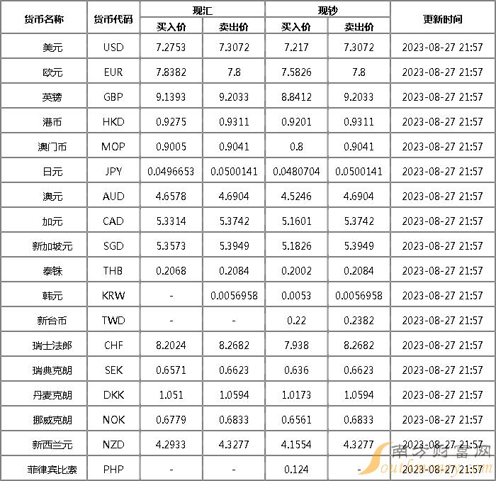 8月26日人民币汇率中间价如下