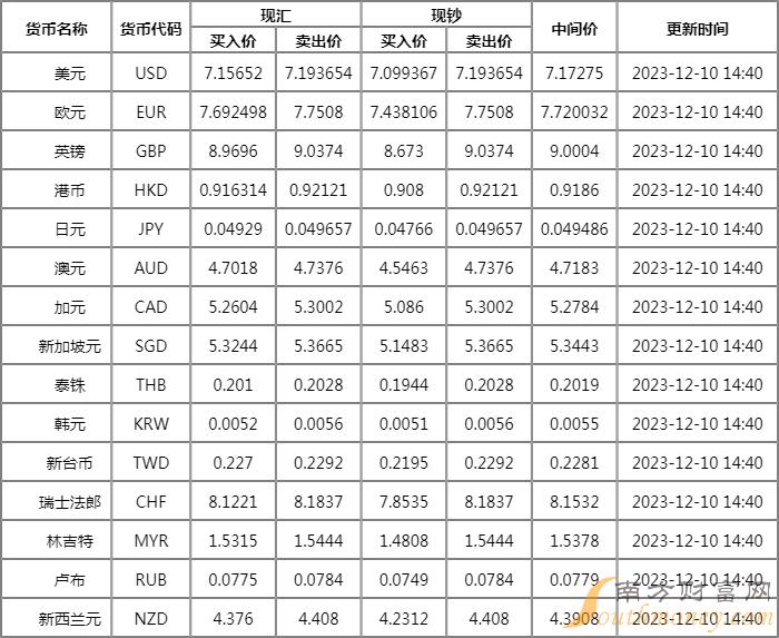 平安银行外汇牌价表2023年12月10日 人民币对美元汇率是多少?随南方财富网蓝猫君来看看。