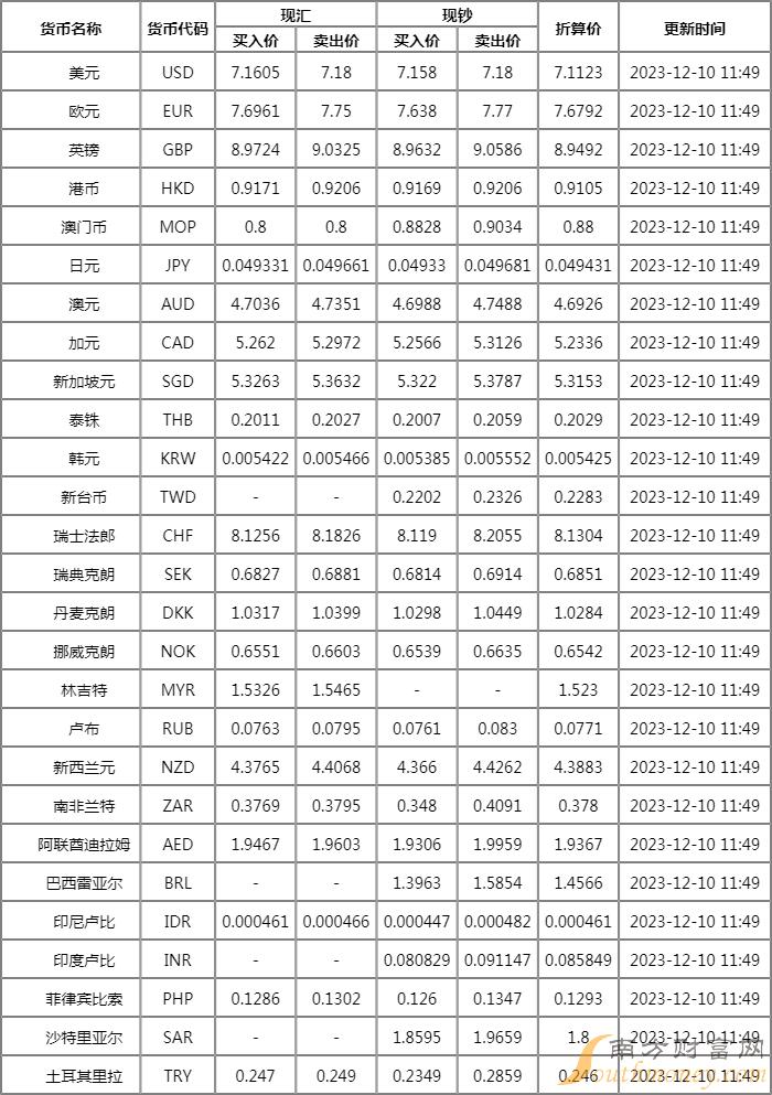中国银行外汇牌价表2023年12月10日 人民币对美元汇率是多少?随南方财富网小南来看看。