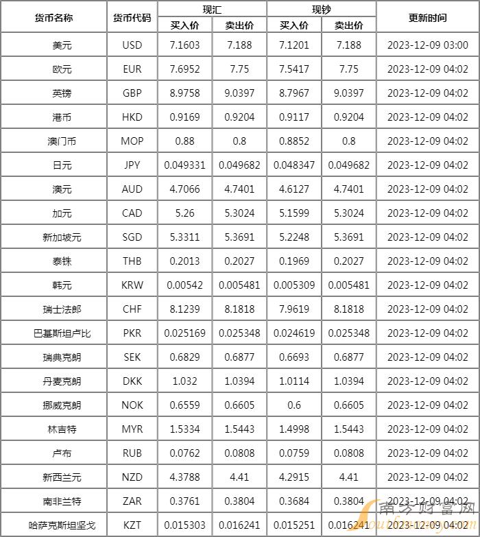 工商银行外汇牌价表2023年12月10日 人民币对美元汇率是多少?随南方财富网老张来看看。