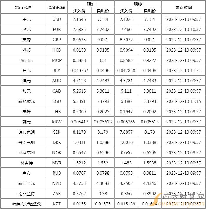 建设银行外汇牌价表2023年12月10日 人民币对美元汇率是多少?随南方财富网袋袋君来看看。