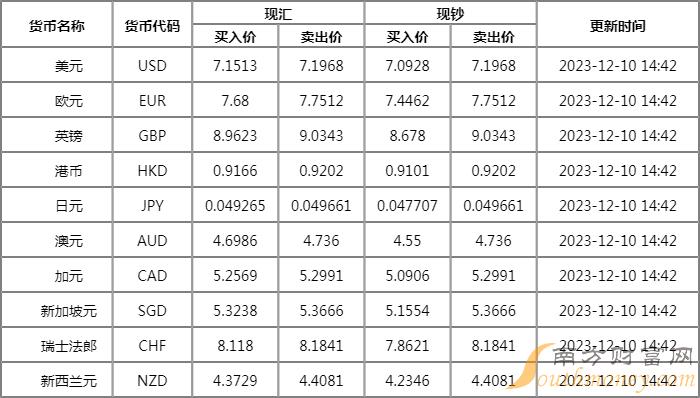 邮储银行外汇牌价表2023年12月10日 人民币对美元汇率是多少?随南方财富网萧哥来看看。