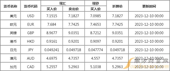 2023年12月8日银行间外汇市场人民币汇率中间价为:1美元对人民币7.1123元,1欧元对人民币7.6792元,100日元对人民币4.9431元,1港元对人民币0.91045元,1英镑对人民币8.9492元,1澳大利亚元对人民币4.6926元,1新西兰元对人民币4.3883元,1新加坡元对人民币5.3153元,1瑞士法郎对人民币8.1304元,1加拿大元对人民币5.2336元,人民币1元对0.65662马来西亚林吉特,人民币1元对12.9723俄罗斯卢布,人民币1元对2.6454南非兰特,人民币1元对184.33韩元,人民币1元对0.51635阿联酋迪拉姆,人民币1元对0.52742沙特里亚尔,人民币1元对49.7833匈牙利福林,人民币1元对0.56467波兰兹罗提,人民币1元对0.9724丹麦克朗,人民币1元对1.4596瑞典克朗,人民币1元对1.5285挪威克朗,人民币1元对4.06545土耳其里拉,人民币1元对2.4590墨西哥比索,人民币1元对4.9297泰铢。