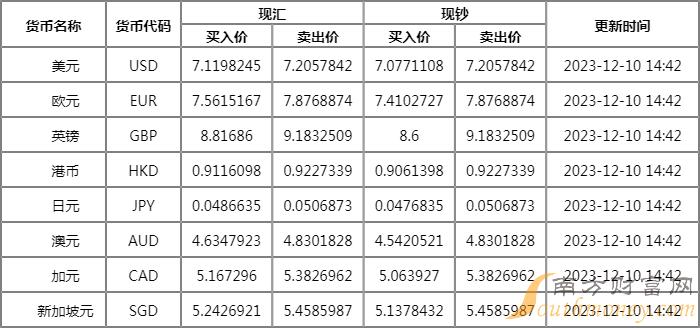 汇丰银行外汇牌价表2023年12月10日 人民币对美元汇率是多少?随南方财富网大脸怪来看看。