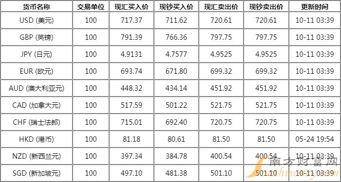 中国招商银行外汇牌价表 10月11日招行人民币对美元汇率是多少?