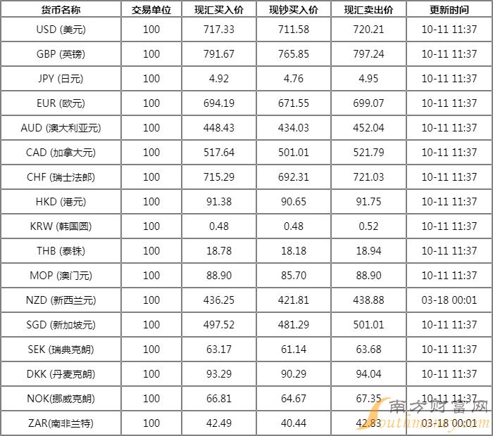 中国农业银行外汇牌价表 10月11日农行人民币汇率是多少?