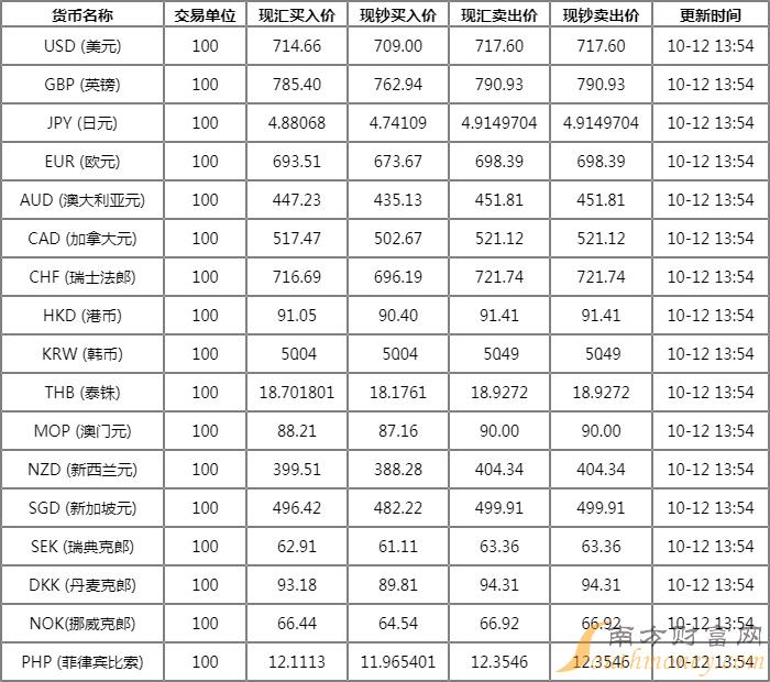 浦发银行外汇牌价表 10月12日浦发银行人民币汇率多少?