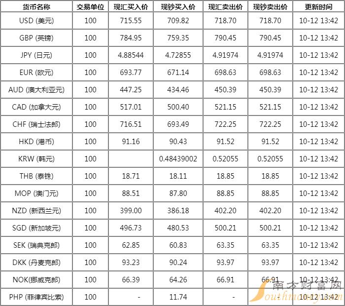 2022年10月12日银行间外汇市场人民币汇率中间价为:1美元对人民币7.1103元,1欧元对人民币6.9243元,100日元对人民币4.8943元,1港元对人民币0.90578元,1英镑对人民币7.8442元,1澳大利亚元对人民币4.4745元,1新西兰元对人民币3.9865元,1新加坡元对人民币4.9633元,1瑞士法郎对人民币7.1606元,1加拿大元对人民币5.1785元,人民币1元对0.65552马来西亚林吉特,人民币1元对9.0644俄罗斯卢布,人民币1元对2.5457南非兰特,人民币1元对200.06韩元,人民币1元对0.51470阿联酋迪拉姆,人民币1元对0.52668沙特里亚尔,人民币1元对62.0945匈牙利福林,人民币1元对0.70184波兰兹罗提,人民币1元对1.0758丹麦克朗,人民币1元对1.5925瑞典克朗,人民币1元对1.5074挪威克朗,人民币1元对2.60429土耳其里拉,人民币1元对2.8178墨西哥比索,人民币1元对5.3321泰铢。