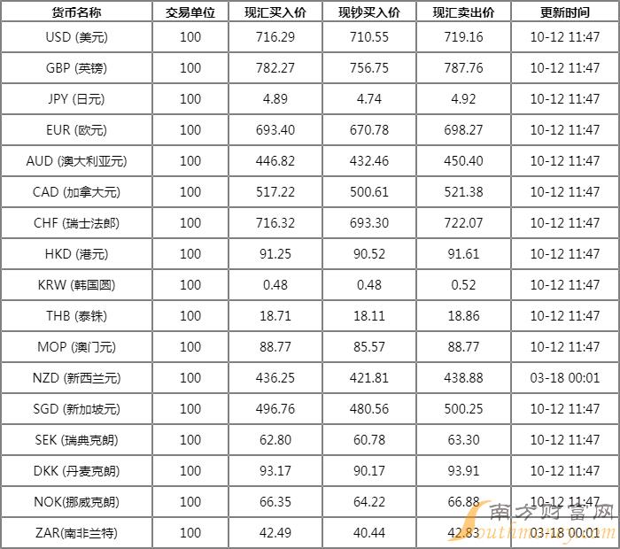中国农业银行外汇牌价表 10月12日农行人民币汇率多少?