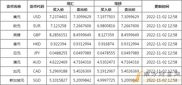 汇丰银行外汇牌价表一览 11月2日汇丰银行人民币汇率走势?下面同南方财富网点金君来看看。
