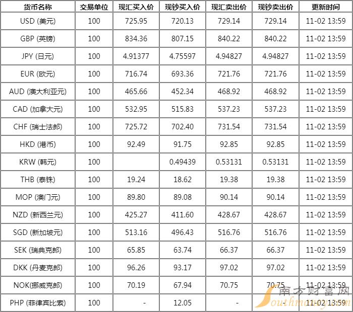 交通银行外汇牌价表一览 11月2日交行人民币汇率走势?下面同南方财富网小蔡来看看。