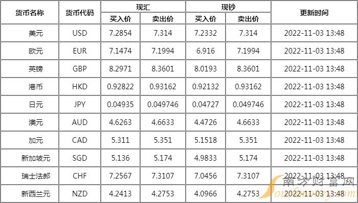 浙商银行外汇牌价表11月3日浙商银行人民币汇率多少?下面同南方财富网袋袋君来看看。