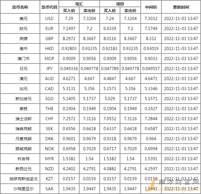 中信银行外汇牌价表11月3日 中信银行人民币汇率走势?下面同南方财富网焦点君来看看。