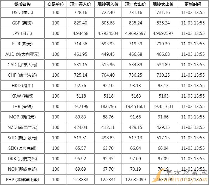 xm外汇:浦发银行外汇牌价表查询11月3日浦发银行人民币汇率中间价多少?