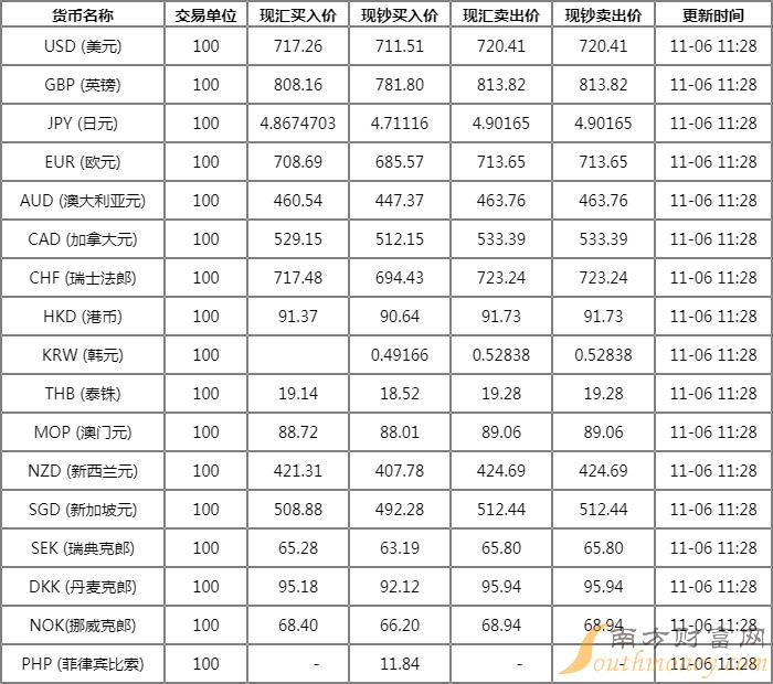 交通银行外汇牌价11月6日 交行人民币汇率多少?下面同南方财富网萧哥来看看。