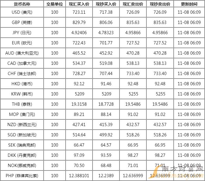 11月8日,人民币对美元中间价上调142个基点,报7.2150。11月7日银行间外汇市场人民币对美元汇率中间价报7.2292,调升263个基点。前一交易日,人民币对美元中间价报7.2555。