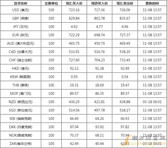 中国农业银行 外汇牌价表11月8日 人民币汇率是多少?下面同南方财富网大耳朵来看看。