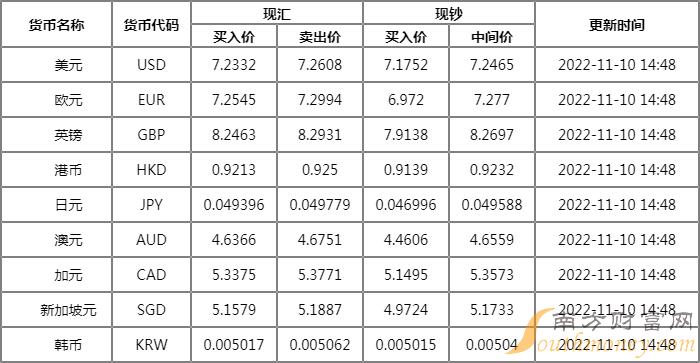 2022年11月10日银行间外汇市场人民币汇率中间价为:1美元对人民币7.2422元,1欧元对人民币7.2523元,100日元对人民币4.9450元,1港元对人民币0.92261元,1英镑对人民币8.2302元,1澳大利亚元对人民币4.6531元,1新西兰元对人民币4.2615元,1新加坡元对人民币5.1631元,1瑞士法郎对人民币7.3605元,1加拿大元对人民币5.3525元,人民币1元对0.65006马来西亚林吉特,人民币1元对8.4254俄罗斯卢布,人民币1元对2.4540南非兰特,人民币1元对188.80韩元,人民币1元对0.50760阿联酋迪拉姆,人民币1元对0.51974沙特里亚尔,人民币1元对55.5717匈牙利福林,人民币1元对0.65090波兰兹罗提,人民币1元对1.0263丹麦克朗,人民币1元对1.5036瑞典克朗,人民币1元对1.4334挪威克朗,人民币1元对2.57078土耳其里拉,人民币1元对2.7096墨西哥比索,人民币1元对5.0898泰铢。