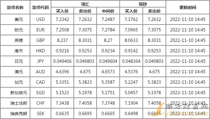 2022年11月10日银行间外汇市场人民币汇率中间价为:1美元对人民币7.2422元,1欧元对人民币7.2523元,100日元对人民币4.9450元,1港元对人民币0.92261元,1英镑对人民币8.2302元,1澳大利亚元对人民币4.6531元,1新西兰元对人民币4.2615元,1新加坡元对人民币5.1631元,1瑞士法郎对人民币7.3605元,1加拿大元对人民币5.3525元,人民币1元对0.65006马来西亚林吉特,人民币1元对8.4254俄罗斯卢布,人民币1元对2.4540南非兰特,人民币1元对188.80韩元,人民币1元对0.50760阿联酋迪拉姆,人民币1元对0.51974沙特里亚尔,人民币1元对55.5717匈牙利福林,人民币1元对0.65090波兰兹罗提,人民币1元对1.0263丹麦克朗,人民币1元对1.5036瑞典克朗,人民币1元对1.4334挪威克朗,人民币1元对2.57078土耳其里拉,人民币1元对2.7096墨西哥比索,人民币1元对5.0898泰铢。