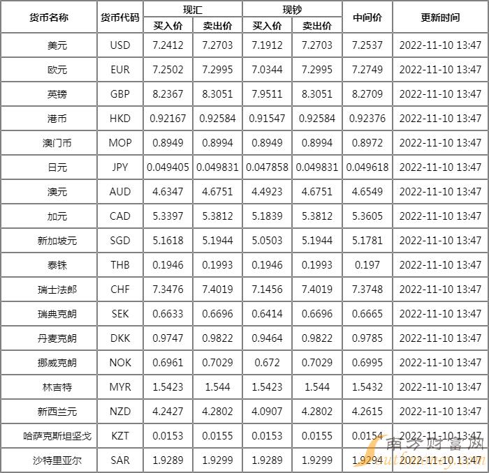 2022年11月10日银行间外汇市场人民币汇率中间价为:1美元对人民币7.2422元,1欧元对人民币7.2523元,100日元对人民币4.9450元,1港元对人民币0.92261元,1英镑对人民币8.2302元,1澳大利亚元对人民币4.6531元,1新西兰元对人民币4.2615元,1新加坡元对人民币5.1631元,1瑞士法郎对人民币7.3605元,1加拿大元对人民币5.3525元,人民币1元对0.65006马来西亚林吉特,人民币1元对8.4254俄罗斯卢布,人民币1元对2.4540南非兰特,人民币1元对188.80韩元,人民币1元对0.50760阿联酋迪拉姆,人民币1元对0.51974沙特里亚尔,人民币1元对55.5717匈牙利福林,人民币1元对0.65090波兰兹罗提,人民币1元对1.0263丹麦克朗,人民币1元对1.5036瑞典克朗,人民币1元对1.4334挪威克朗,人民币1元对2.57078土耳其里拉,人民币1元对2.7096墨西哥比索,人民币1元对5.0898泰铢。