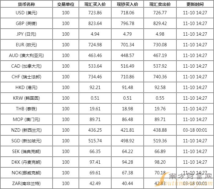 中国农业银行外汇牌价表 11月10日农行人民币汇率是多少?下面同南方财富网怪咖君来看看。