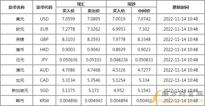 2022年11月14日银行间外汇市场人民币汇率中间价为1美元对人民币7.0899元,1欧元对人民币7.3264元,100日元对人民币5.0853元,1港元对人民币0.90449元,1英镑对人民币8.3660元,1澳大利亚元对人民币4.7437元,1新西兰元对人民币4.3273元,1新加坡元对人民币5.1597元,1瑞士法郎对人民币7.5152元,1加拿大元对人民币5.3427元,人民币1元对0.65184林吉特,人民币1元对8.5627俄罗斯卢布,人民币1元对2.4399南非兰特,人民币1元对185.59韩元,人民币1元对0.51799阿联酋迪拉姆,人民币1元对0.53020沙特里亚尔,人民币1元对55.2987匈牙利福林,人民币1元对0.63903波兰兹罗提,人民币1元对1.0159丹麦克朗,人民币1元对1.4668瑞典克朗,人民币1元对1.4007挪威克朗,人民币1元对2.61661土耳其里拉,人民币1元对2.7559墨西哥比索,人民币1元对5.0735泰铢。