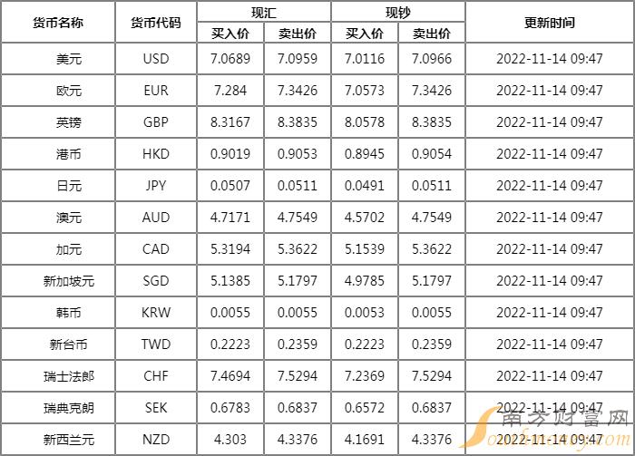 兴业银行外汇牌价11月14日 兴业银行人民币汇率多少?下面同南方财富网萧哥来看看。