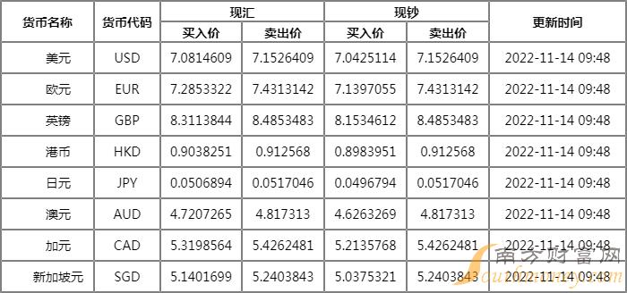 汇丰银行外汇牌价11月14日 汇丰银行人民币汇率多少?下面同南方财富网老张来看看。
