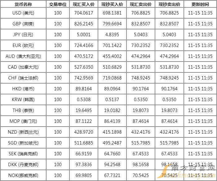 11月15日,人民币兑美元中间价报7.0421,调升478个基点,创2022年9月26日以来最高;前一交易日中间价报7.0899,人民币16:30收盘价报7.0378,23:30夜盘收报7.0710。
