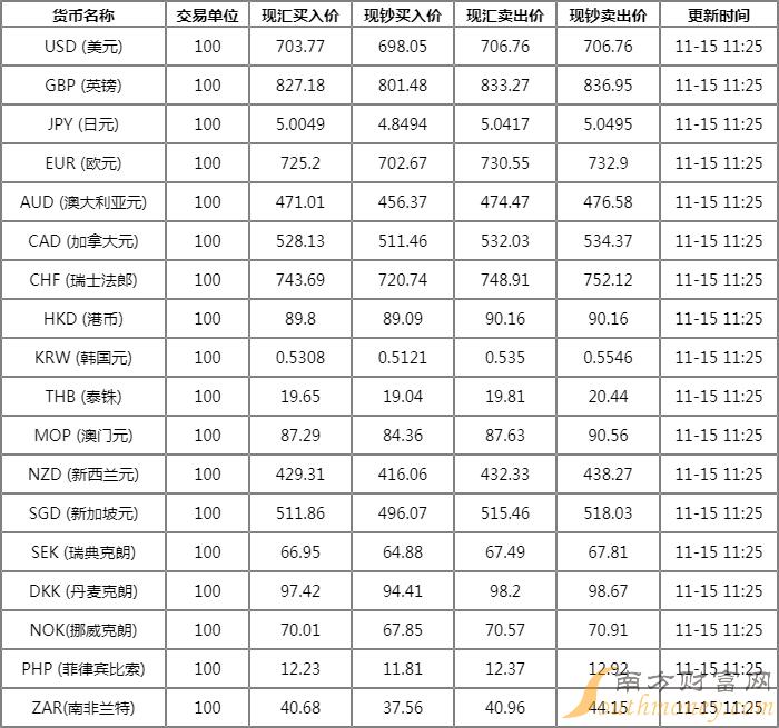 xm外汇:中国银行外汇牌价表11月15日中行人民币对美元汇率多少?