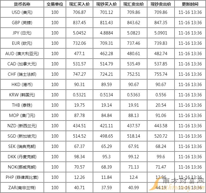 中国银行外汇牌价表 11月16日中行人民币汇率是多少? 下面同南方财富网焦点君来看看。