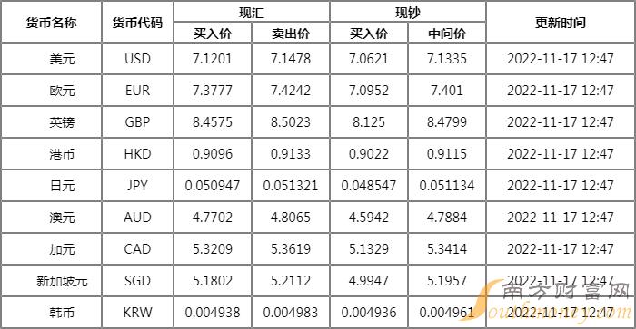 2022年11月17日银行间外汇市场人民币汇率中间价为:1美元对人民币7.0655元,1欧元对人民币7.3442元,100日元对人民币5.0635元,1港元对人民币0.90323元,1英镑对人民币8.4189元,1澳大利亚元对人民币4.7634元,1新西兰元对人民币4.3446元,1新加坡元对人民币5.1599元,1瑞士法郎对人民币7.4851元,1加拿大元对人民币5.3033元,人民币1元对0.64350马来西亚林吉特,人民币1元对8.5541俄罗斯卢布,人民币1元对2.4410南非兰特,人民币1元对188.28韩元,人民币1元对0.51982阿联酋迪拉姆,人民币1元对0.53194沙特里亚尔,人民币1元对55.7977匈牙利福林,人民币1元对0.64053波兰兹罗提,人民币1元对1.0129丹麦克朗,人民币1元对1.4826瑞典克朗,人民币1元对1.4147挪威克朗,人民币1元对2.63636土耳其里拉,人民币1元对2.7370墨西哥比索,人民币1元对5.0546泰铢。