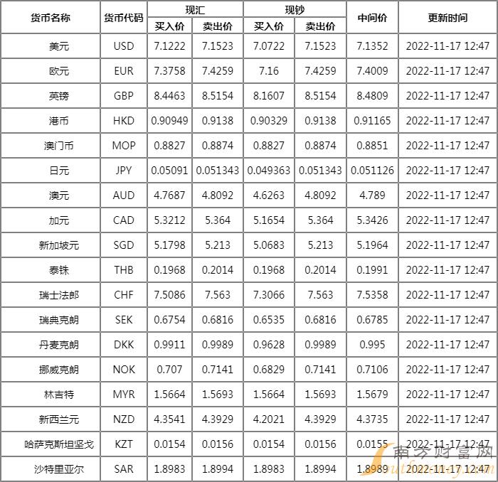 中信银行外汇牌价表 11月17日中信银行人民币汇率中间价多少?下面同南方财富网李才君来看看。