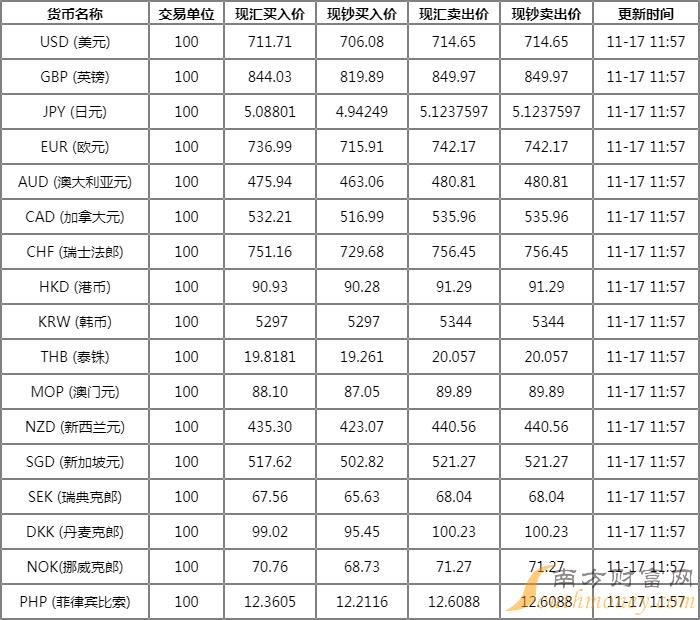 浦发银行外汇牌价 11月17日浦发银行人民币汇率中间价多少?下面同南方财富网小语来看看。