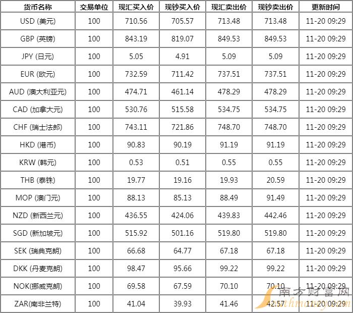 xm外汇:建设银行外汇牌价表11月20日建设银行美元汇率多少?