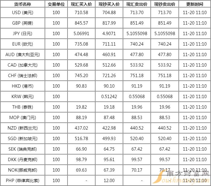 交通银行外汇牌价表11月20日交行人民币对美元汇率多少?下面同南方财富网怪咖君来看看。