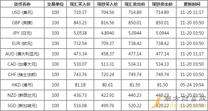 xm外汇:中国招商银行外汇牌价表11月20日 招行人民币对美元汇率多少?