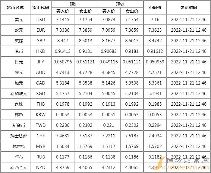2022年11月21日银行间外汇市场人民币汇率中间价为:1美元对人民币7.1256元,1欧元对人民币7.3551元,100日元对人民币5.0770元,1港元对人民币0.91108元,1英镑对人民币8.4654元,1澳大利亚元对人民币4.7565元,1新西兰元对人民币4.3837元,1新加坡元对人民币5.1809元,1瑞士法郎对人民币7.4680元,1加拿大元对人民币5.3252元,人民币1元对0.64050马来西亚林吉特,人民币1元对8.4632俄罗斯卢布,人民币1元对2.4185南非兰特,人民币1元对188.29韩元,人民币1元对0.51556阿联酋迪拉姆,人民币1元对0.52759沙特里亚尔,人民币1元对55.3841匈牙利福林,人民币1元对0.63973波兰兹罗提,人民币1元对1.0113丹麦克朗,人民币1元对1.4939瑞典克朗,人民币1元对1.4293挪威克朗,人民币1元对2.61468土耳其里拉,人民币1元对2.7317墨西哥比索,人民币1元对5.0262泰铢。