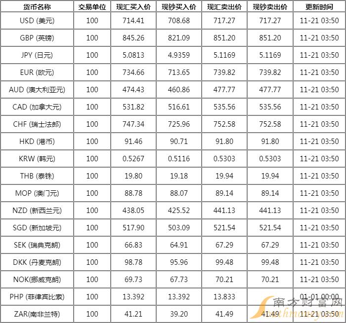 中国工商银行外汇牌价表11月21日 工行汇率中间价如何?下面同南方财富网侃财君来看看。