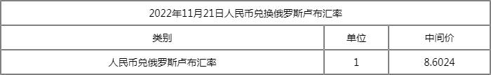 2022年11月21日银行间外汇市场人民币汇率中间价为:1美元对人民币7.1256元,1欧元对人民币7.3551元,100日元对人民币5.0770元,1港元对人民币0.91108元,1英镑对人民币8.4654元,1澳大利亚元对人民币4.7565元,1新西兰元对人民币4.3837元,1新加坡元对人民币5.1809元,1瑞士法郎对人民币7.4680元,1加拿大元对人民币5.3252元,人民币1元对0.64050马来西亚林吉特,人民币1元对8.4632俄罗斯卢布,人民币1元对2.4185南非兰特,人民币1元对188.29韩元,人民币1元对0.51556阿联酋迪拉姆,人民币1元对0.52759沙特里亚尔,人民币1元对55.3841匈牙利福林,人民币1元对0.63973波兰兹罗提,人民币1元对1.0113丹麦克朗,人民币1元对1.4939瑞典克朗,人民币1元对1.4293挪威克朗,人民币1元对2.61468土耳其里拉,人民币1元对2.7317墨西哥比索,人民币1元对5.0262泰铢。