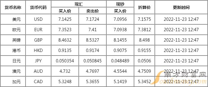 邮储银行外汇牌价表 11月23日邮储银行外币汇率多少?下面同南方财富网大眼君来看看